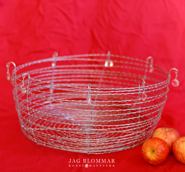 Trots att jag var så trött att jag nästan såg i kors igår kväll så jobbade jag på och gjorde klart en ganska stor korg i luffarslöjd. Den är ca 40 cm i diameter och har prismor från gamla kristallkronor hängandes runtom. Det tar endel timmar att göra en sådan här eftersom jag snurrar den tunna tråden runt den grövre för hand, varv efter varv. Den här korgen kommer att finnas till salu på Rabarber Konsthantverk i Piteå från och med idag.